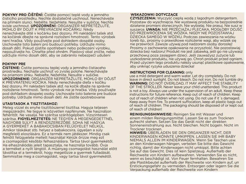 UPOZORNĚNÍ! Tašku nepřetěžujte, mohlo by dojít k převrácení kočárku! Nikdy nenechávejte dítě v kočárku bez dozoru. Při nakládání tašek na kočárek dbejte na správné rozložení hmotnosti. Tento výrobek není hračka. Vždy používejte pod dohledem dospělé osoby. Uschovejte si toto balení pro budoucí potřeby. Pokud zjistíte opotřebení nebo poškození výrobku, nepoužívejte jej. Chraňte před ohněm. Plastový obal zničte nebo udržujte mimo dosah dětí, aby se zabránilo nebezpečí udušení.