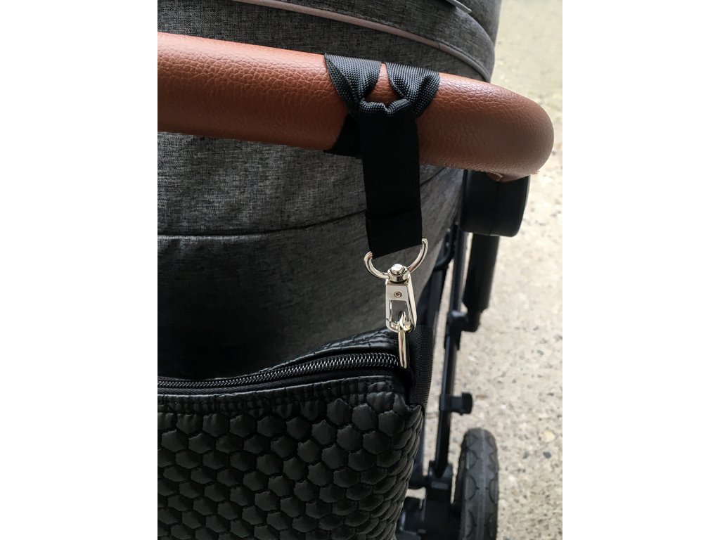 Pásky s karabinkami, které slouží k uchycení tašky nebo kabelky na madlo kočárku.