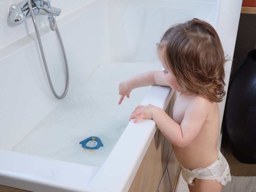 Teploměr pro kontrolu teploty vody v dětské koupeli plave na hladině pro snadné čtení změřené teploty.
