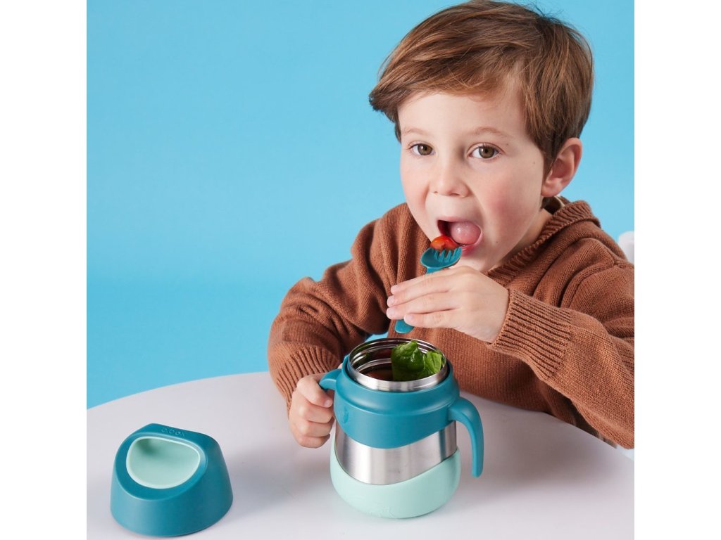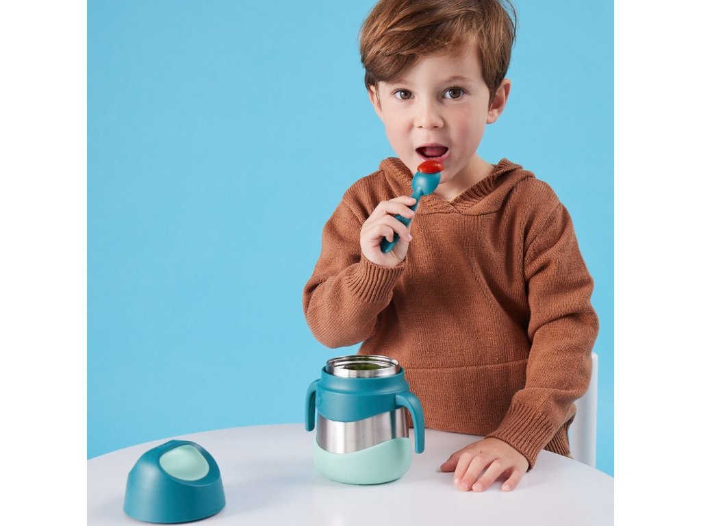 Dvouplášťová široká termoska, aby malé ručičky dosáhly na poslední sousto na dně. Na víčku je "ouško", za které je možné termosku nosit nebo zavěsit na karabinu. Kromě toho je toto "ouško" skvělé i pro slabé nebo malé ruce - vložením prstů do otvoru a pootočením lze využít "páky" a tak je otevření snadné jak pro děti, tak i pro starší lidi. Ucha po stranách termosky i kryt chránící dno termosky z venku jsou odnímatelné.