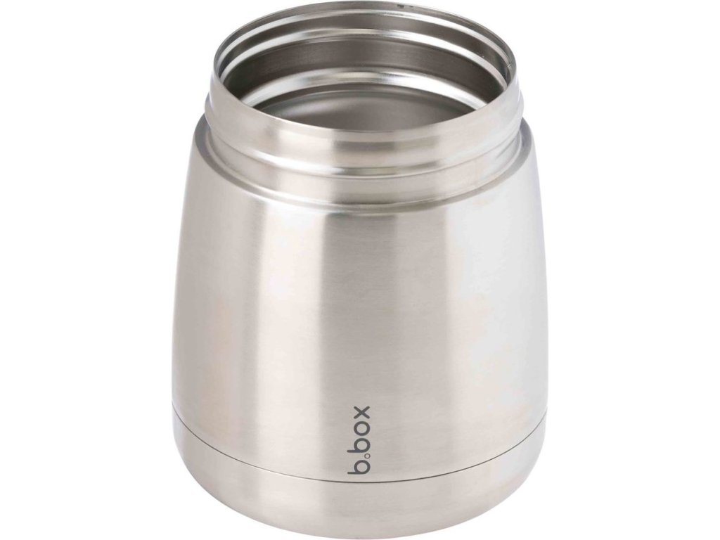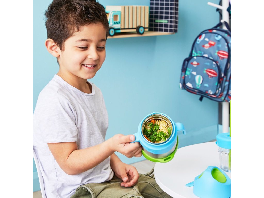 Dvouplášťová široká termoska, aby malé ručičky dosáhly na poslední sousto na dně. Na víčku je "ouško", za které je možné termosku nosit nebo zavěsit na karabinu. Kromě toho je toto "ouško" skvělé i pro slabé nebo malé ruce - vložením prstů do otvoru a pootočením lze využít "páky" a tak je otevření snadné jak pro děti, tak i pro starší lidi. Ucha po stranách termosky i kryt chránící dno termosky z venku jsou odnímatelné.
