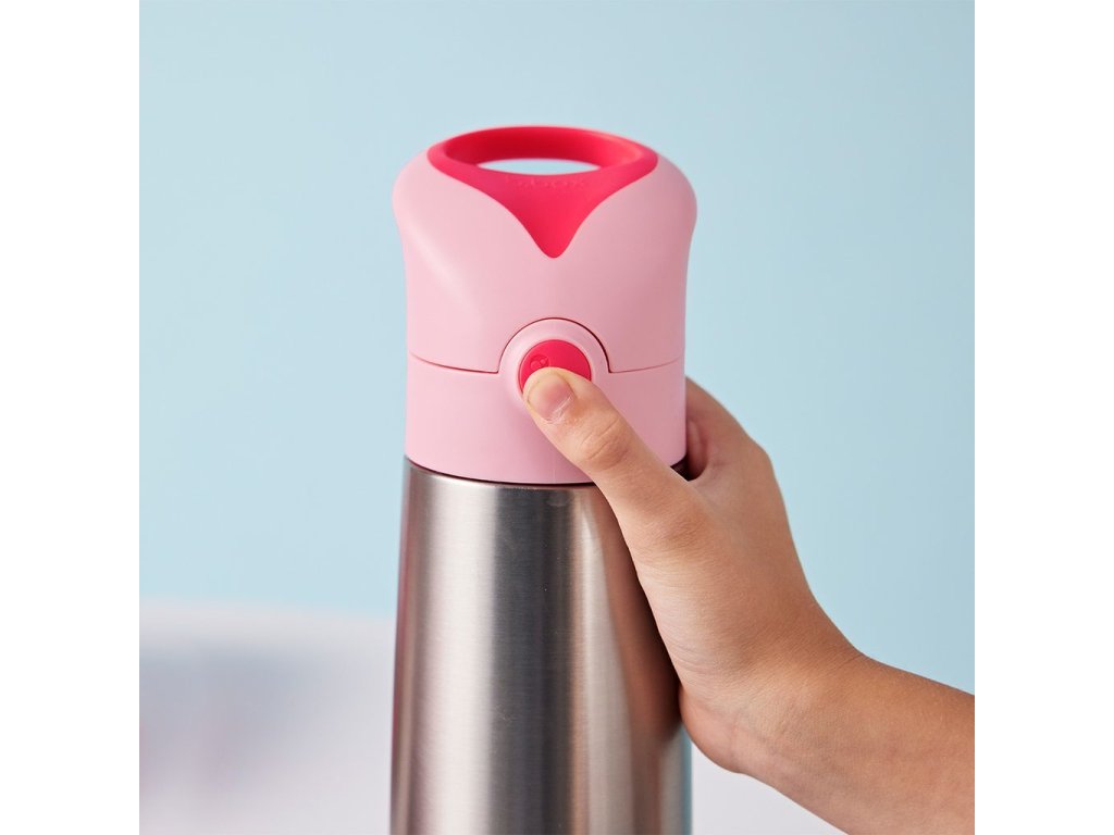Dvouplášťová termoska z nerezové oceli udrží tekutiny studené až 15 hodin a teplé až 8 hodin. Silikonové brčko dovolí vypít z termosky i tu poslední kapku a víčko má držátko pro snadné nošení nebo zavěšení na batoh, kočárek apod. Termoska se po snadném zmáčknutí "tlačítka" lehce otevře.
