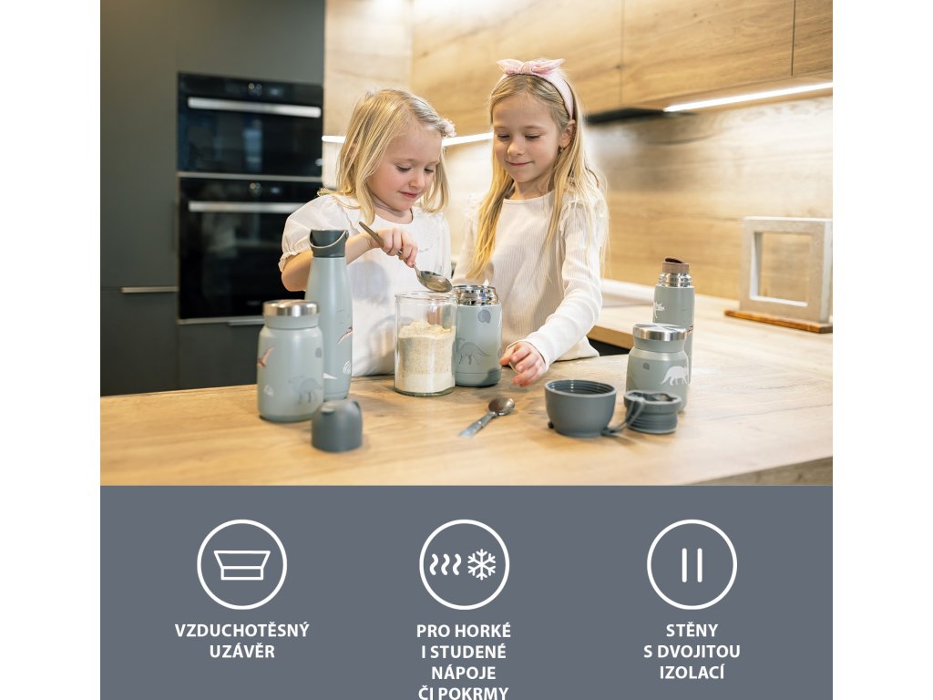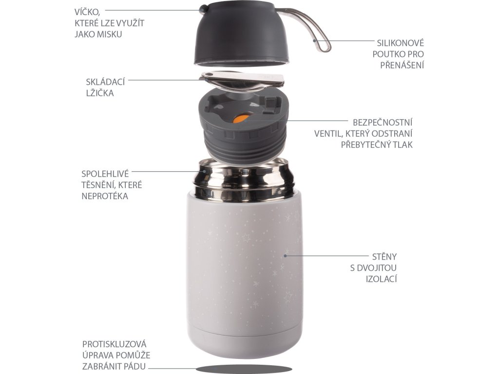 teplou kaši nebo polévku kdekoliv. Víčko termosky lze použít jako hrníček či