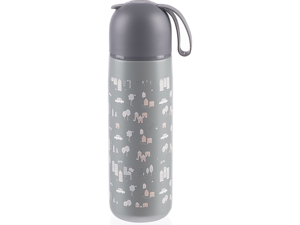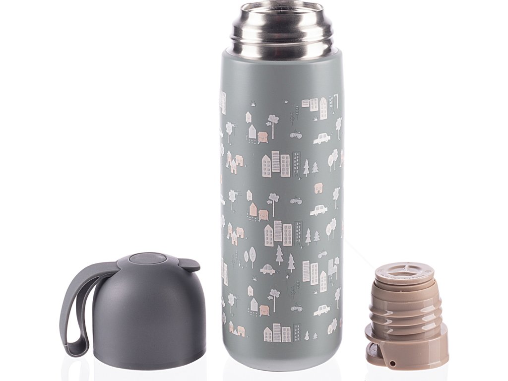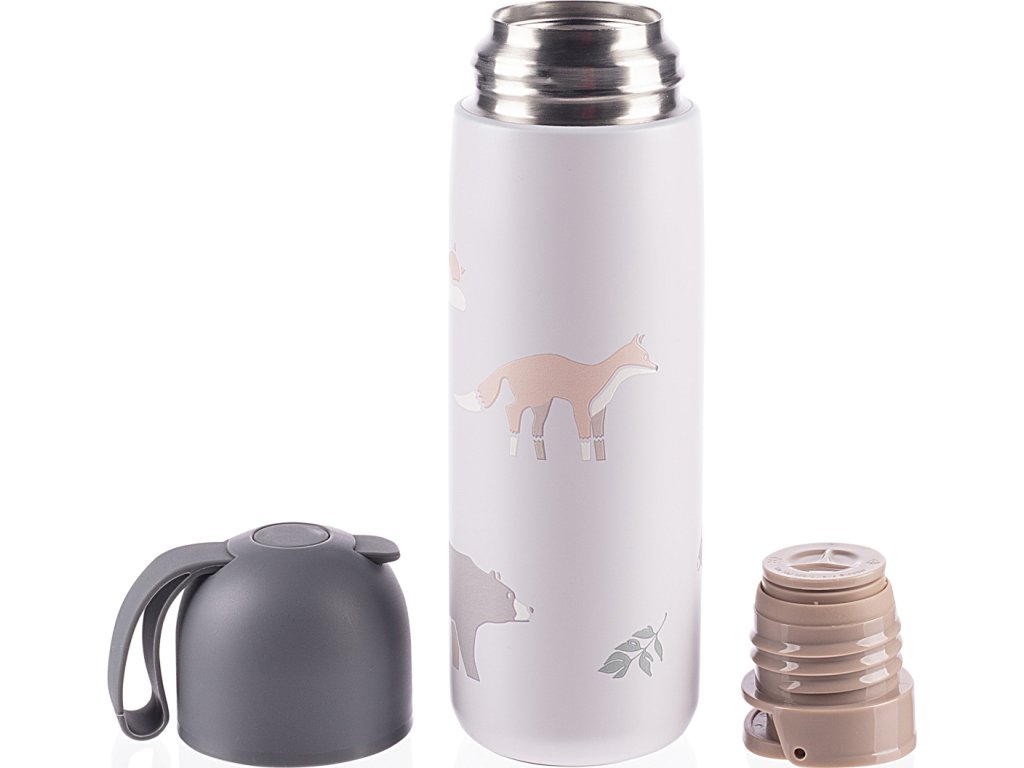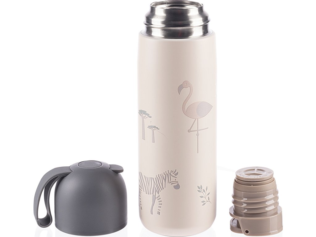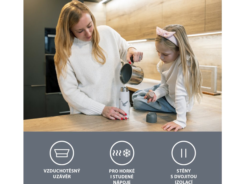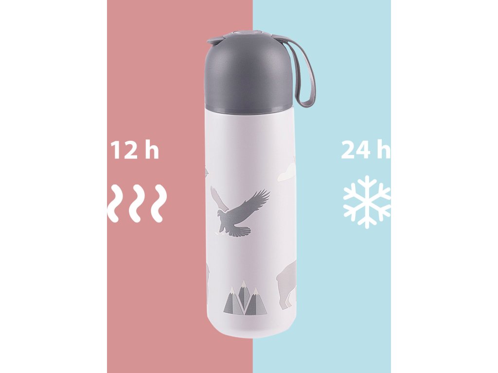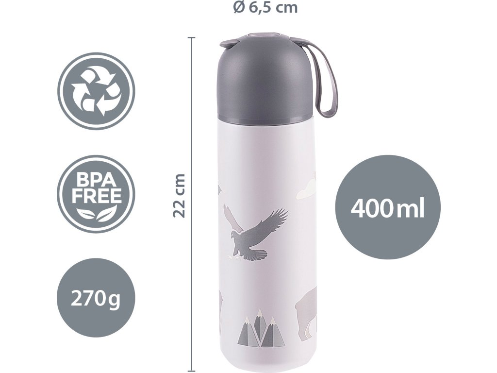Kvalitní termoska na tekutiny o objemu 400 ml uchovává horké nápoje až 12 hodin, studené až po dobu 24 hodin. Je vyrobena z kvalitní nerezové oceli, která je odolná vůči korozi. Těsné víčko zajišťuje, že termoska neprotéká a vrchní uzávěr pro pohodlné nalévání se postará o to, abyste se nepolili ani při jízdě autem na nerovné cestě, taktéž si můžete být jisti, že se dítě neopaří tekutinou z termosky vzhledem ke dvojitému uzávěru. Víčko termosky lze použít jako hrníček.
