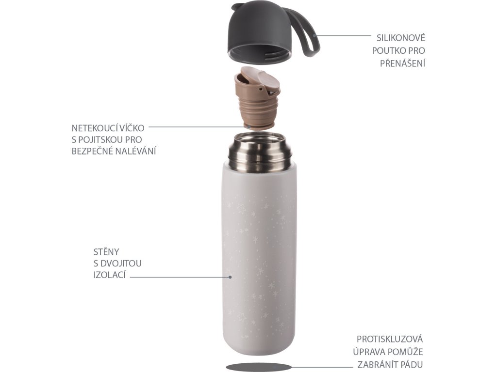 Díky vakuové izolaci se termoska při naplnění horkou tekutinou nezahřívá z venku. K pohodlnému uchopení je termoska vybavená silikonovým držákem nápoje.