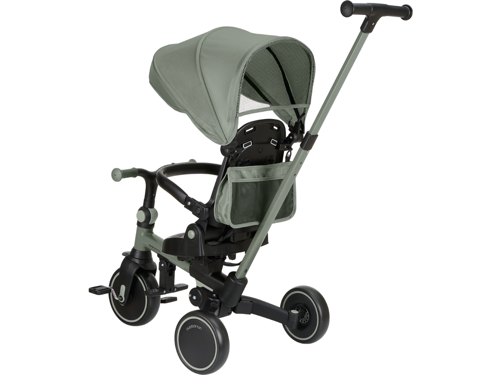 Pro maximální bezpečí je tříkolka vybavená 5-bodovým pásem, odnímatelným bezpečnostním madlem a nastavitelnou stříškou, kterou lze podle potřeby odejmout. Nechybí sklápěcí opěrka zad nastavitelná do 4 poloh, nastavitelná řídítka a otočné sedátko.