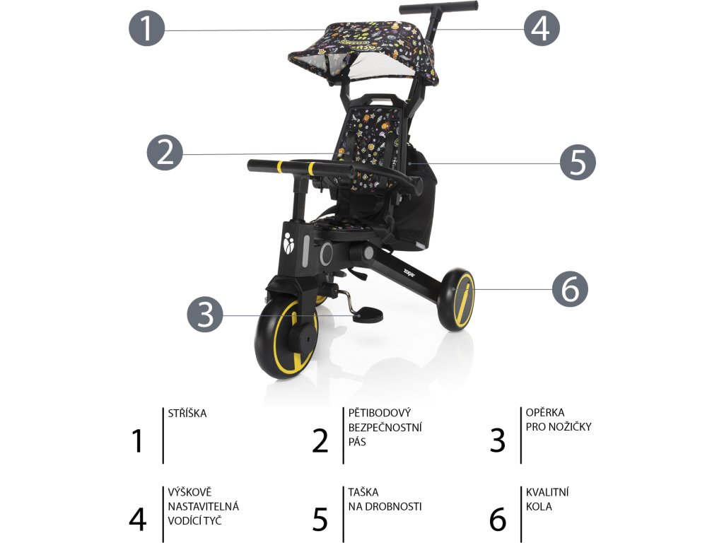 bezpečnostní pás, polohovatelná hrazda, brzda koleček a odnímatelná stříška