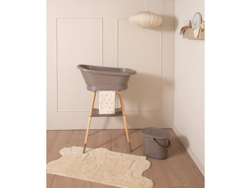 Velmi stabilní vanový stojan Sense má nohy vyrobené z lakovaného bukového dřeva s certifikací FSC. To dodává stojanu teplý moderní vzhled. Je vybaven praktickými pomůckami; vpředu je připevněn držák na ručníky. Prostorná plastová polička poskytuje dostatek místa například pro šampon, žínku, vodní hračky nebo koupací gel. To znamená, že máte po ruce všechny potřebné věci, abyste si s malým mohli v klidu koupání užít. Inovativní systém upevnění zajišťuje, že vanu lze snadno připevnit ke stojanu a stejně snadno sejmout. Po kliknutí můžete své miminko nerušeně a bezpečně koupat.