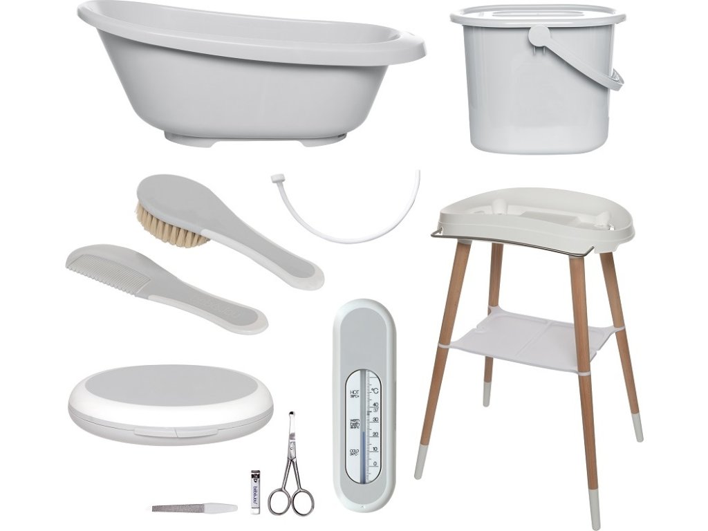 Sada obsahuje: vaničku Sense a luxusní stojan z lakovaného buku, kyblík na plenky, sadu na manikúru, hřeben a kartáč, teploměr do vaničky a vypouštěcí hadici. Zkrátka vaše kompletní vybavení pro péči a koupání!