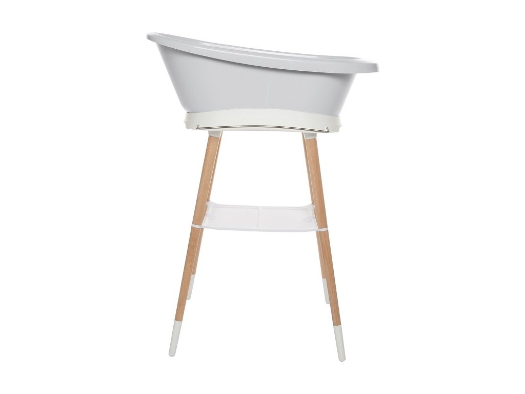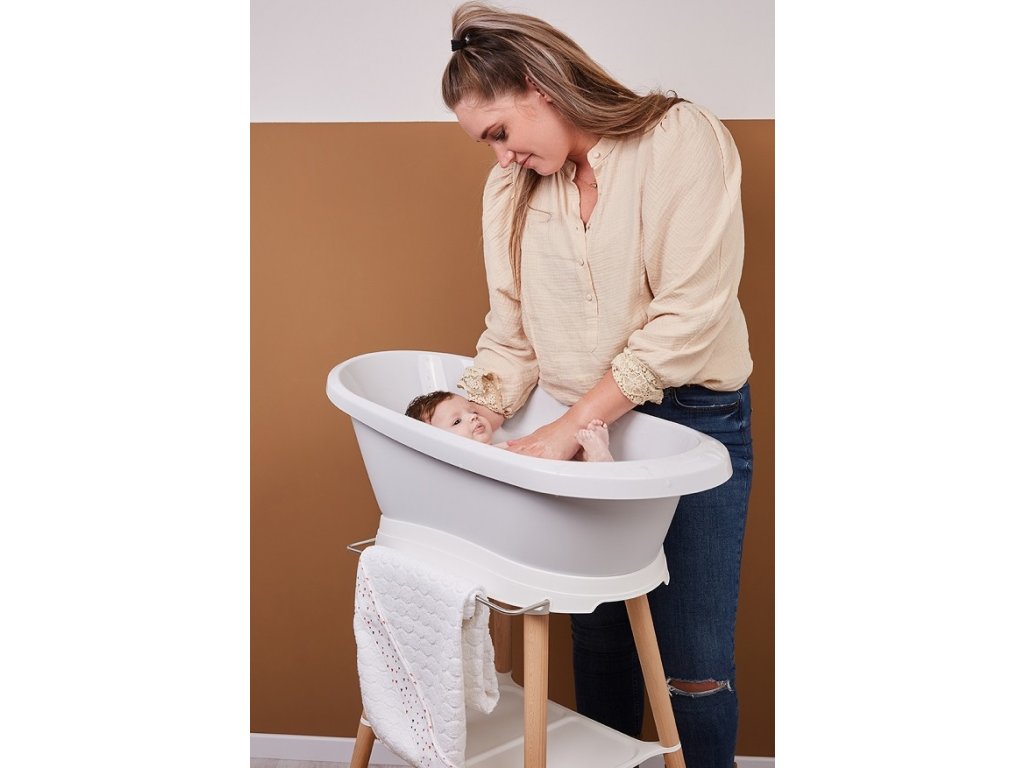 Velmi stabilní vanový stojan Sense má nohy vyrobené z lakovaného bukového dřeva s certifikací FSC. To dodává stojanu teplý moderní vzhled. Je vybaven praktickými pomůckami; vpředu je připevněn držák na ručníky. Prostorná plastová polička poskytuje dostatek místa například pro šampon, žínku, vodní hračky nebo koupací gel. To znamená, že máte po ruce všechny potřebné věci, abyste si s malým mohli v klidu koupání užít. Inovativní systém upevnění zajišťuje, že vanu lze snadno připevnit ke stojanu a stejně snadno sejmout. Po kliknutí můžete své miminko nerušeně a bezpečně koupat.