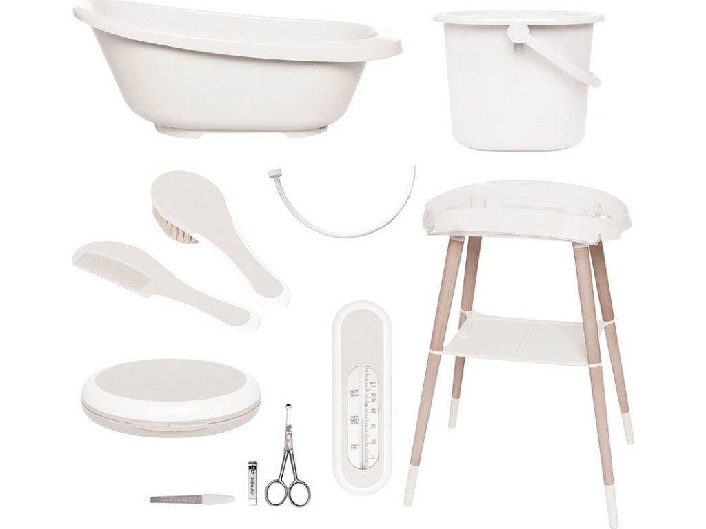 Sada obsahuje: vaničku Sense a luxusní stojan z lakovaného buku, kyblík na plenky, sadu na manikúru, hřeben a kartáč, teploměr do vaničky a vypouštěcí hadici. Zkrátka vaše kompletní vybavení pro péči a koupání!