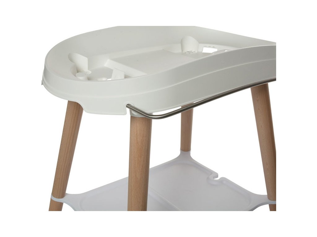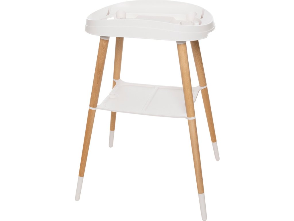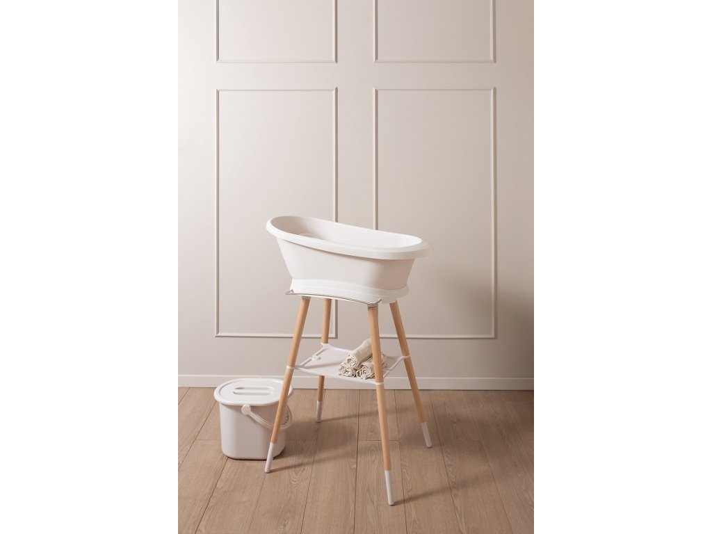 Velmi stabilní vanový stojan Sense má nohy vyrobené z lakovaného bukového dřeva s certifikací FSC. To dodává stojanu teplý moderní vzhled. Je vybaven praktickými pomůckami; vpředu je připevněn držák na ručníky. Prostorná plastová polička poskytuje dostatek místa například pro šampon, žínku, vodní hračky nebo koupací gel. To znamená, že máte po ruce všechny potřebné věci, abyste si s malým mohli v klidu koupání užít. Inovativní systém upevnění zajišťuje, že vanu lze snadno připevnit ke stojanu a stejně snadno sejmout. Po kliknutí můžete své miminko nerušeně a bezpečně koupat.