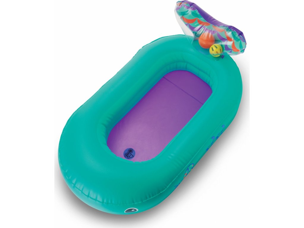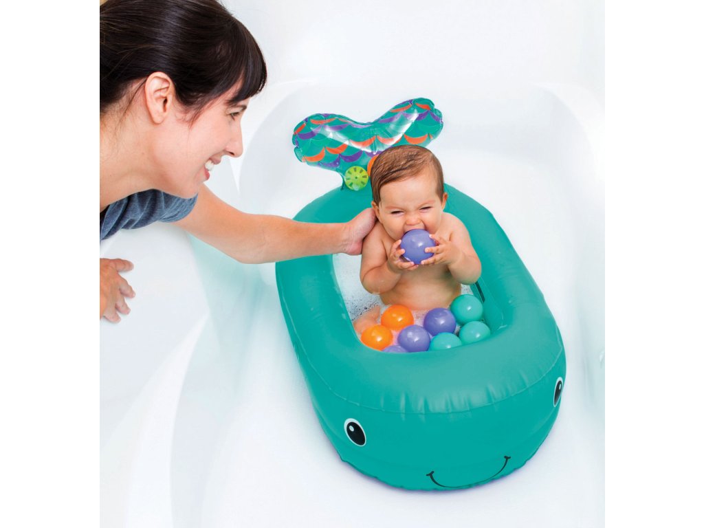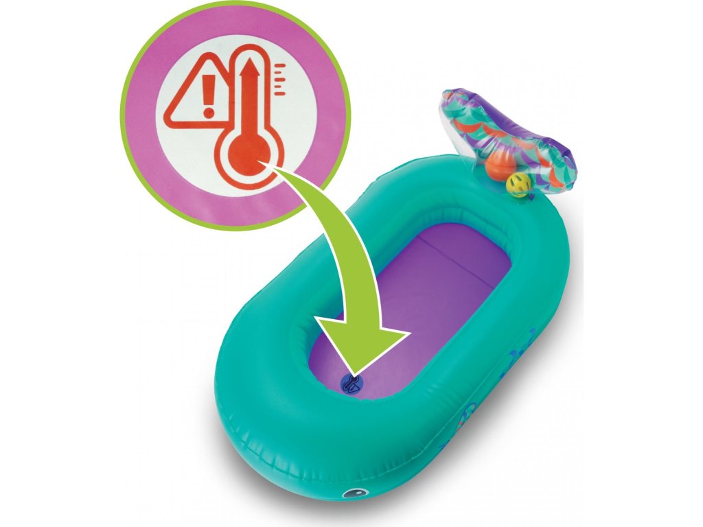 Nafukovací vaničku v podobě velryby využijete doma i na cestách. Teplotní senzor ve vaničce vám pomůže hlídat optimální teplotu pro koupání, která by měla být v rozmezí 32,2°C a 37,8°C. Při tomto optimálním rozmezí teploty vody se senzor zabarví.