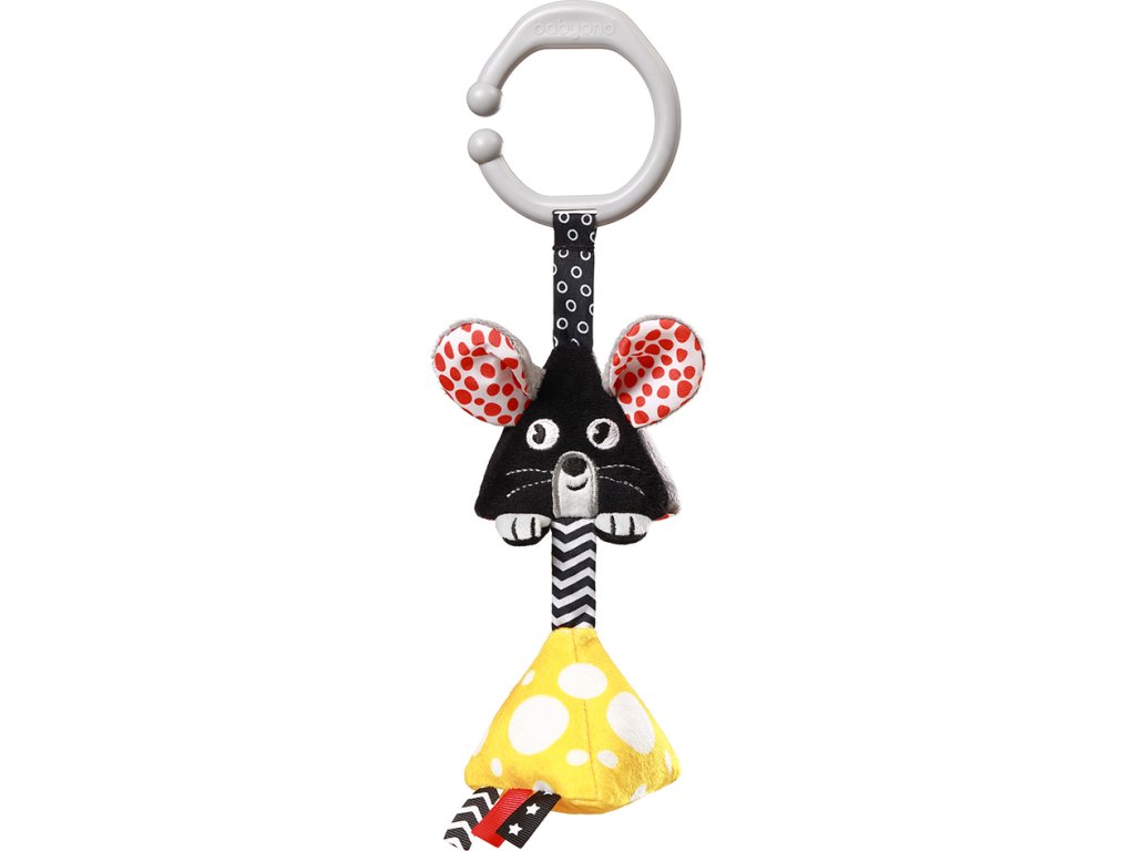 Závěsná kontrastní hračka v podobě myšky uvede vaše dítě do světa prvních barev, zvuků a textur. Připevněte ji na postýlku, kočárek nebo autosedačku.