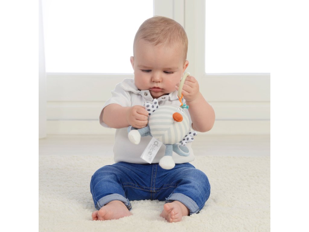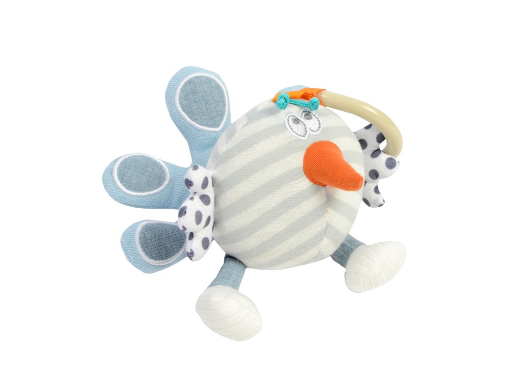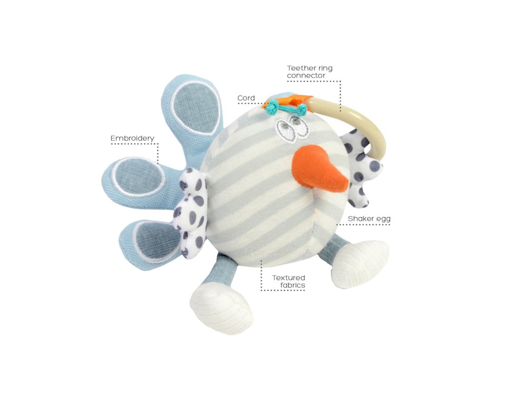 Páv je vyroben z různých druhů textilií, které rozvíjí hmatové schopnosti. Různé aktivity zvířátka nabízí pro malé zvídavé děti skvělou zábavu a podporují správný rozvoj jemné a hrubé motoriky. Pomocí praktického kroužku je možné zvířátko zavěsit téměř kdekoliv.