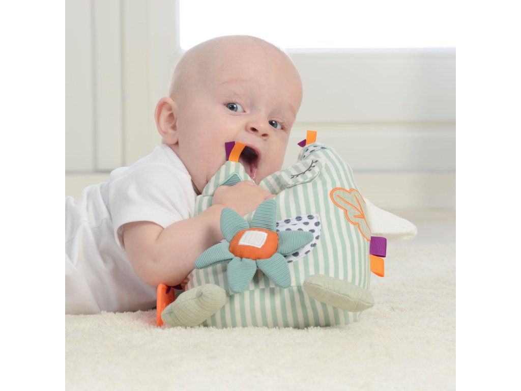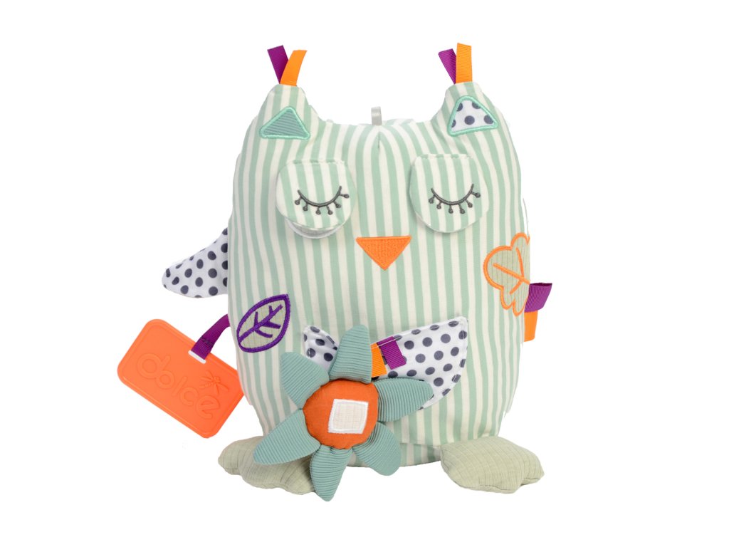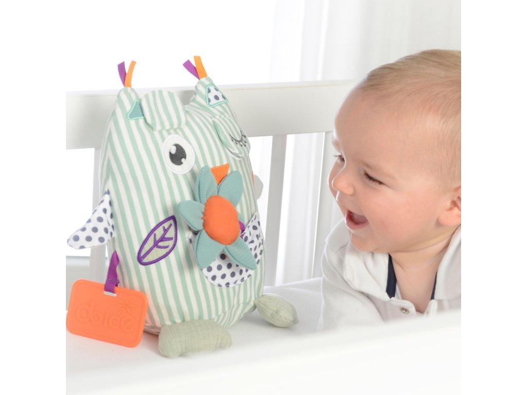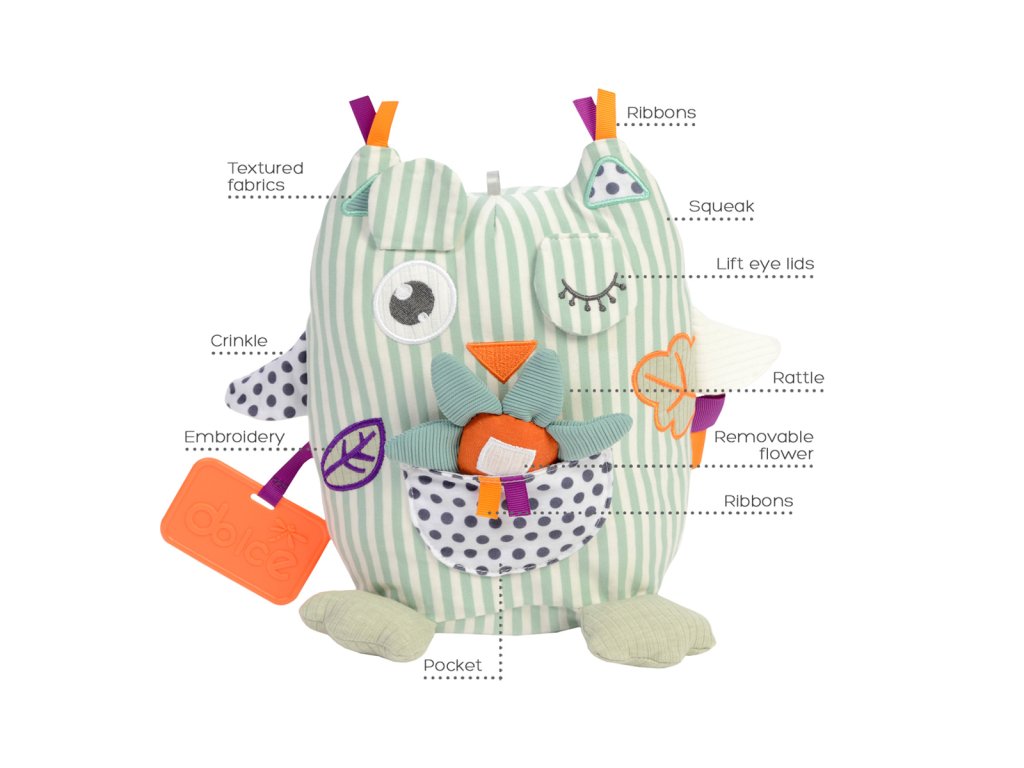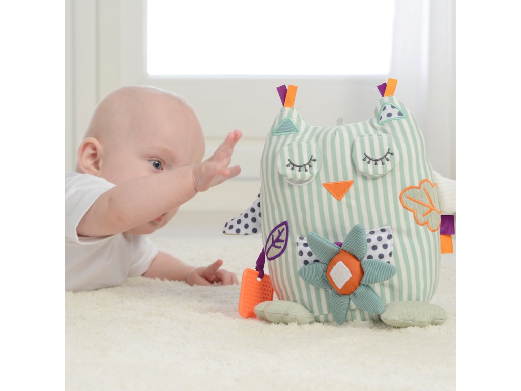 Sova je vyrobena z různých druhů textilií, které rozvíjí hmatové schopnosti. Různé aktivity zvířátka nabízí pro malé zvídavé děti skvělou zábavu a podporují správný rozvoj jemné a hrubé motoriky.