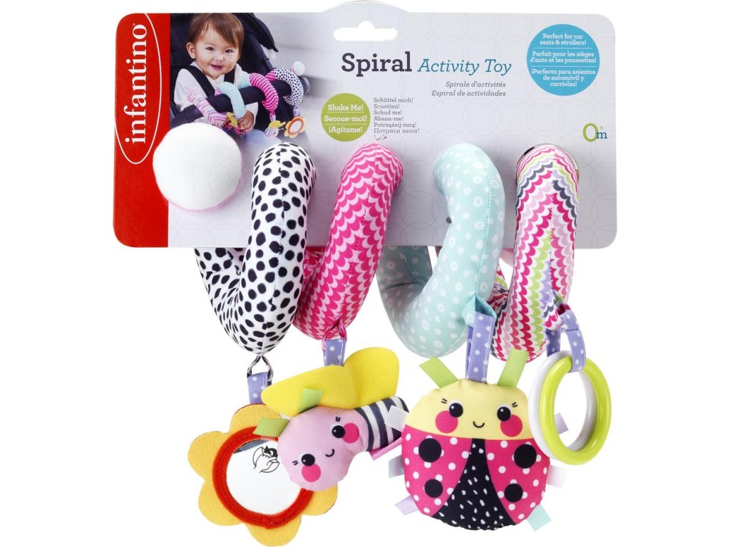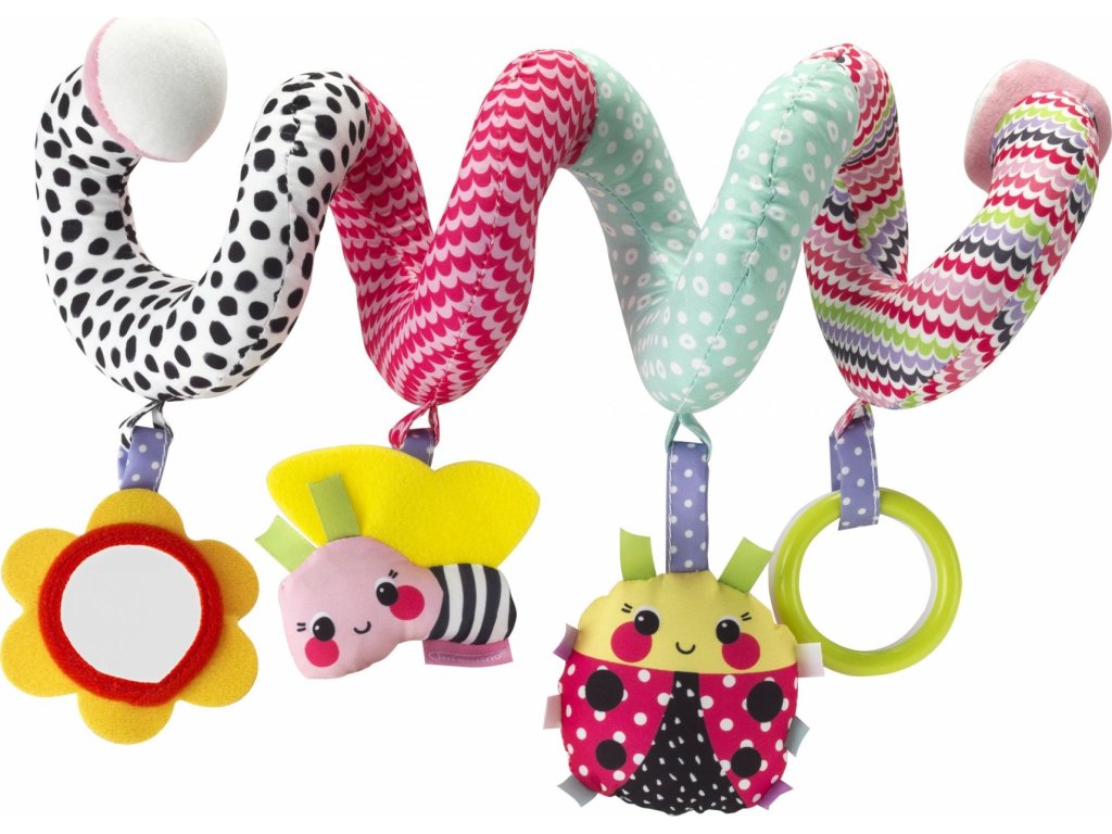 Spirálu snadno připevníte k madlu kočárku, autosedačky či na postýlku. Zavěšené chrasticí a šusticí hračky ve výrazných barvách i bezpečné zrcátko upoutají pozornost dítěte a pomáhají rozvoji jeho smyslů.