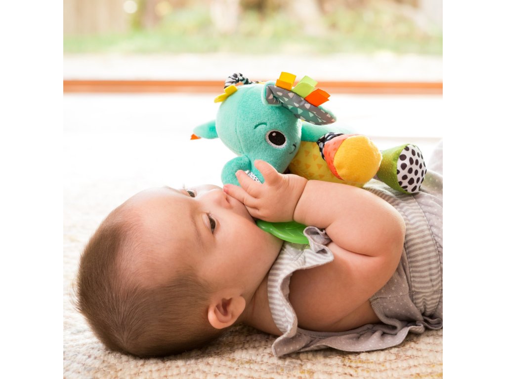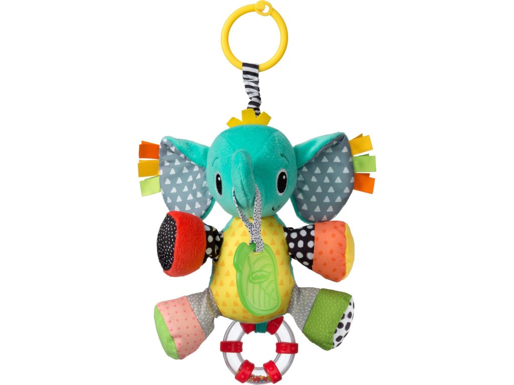 Různobarevný slon upoutá pozornost dítěte svými výraznými barvami i chrastěním při pohybu. Po zatažení za šňůrku vibruje. Různorodé textury lákají dítě ke zkoumání. Kousátko pomáhá dítěti při prořezávání prvních zoubků.