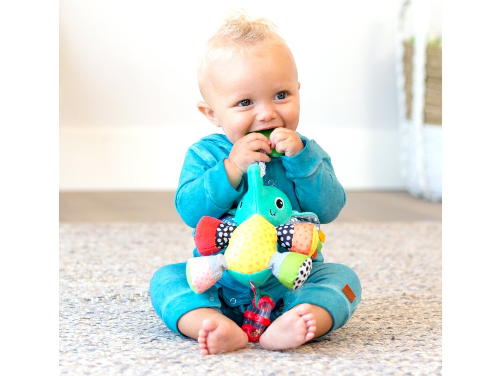 Hračku je možné zavěsit na autosedačku, kočárek či hrazdu na hrací dece.