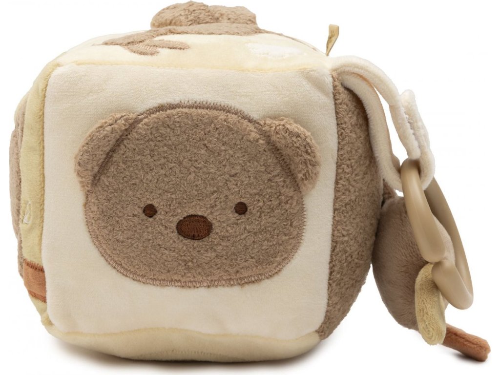 Měkká plyšová kostka s krásnými motivy klokana, koaly a medvídka je díky svému provedení snadno uchopitelná malými dětskými ručičkami. Různorodé textury, vyšívané ilustrace, bezpečné zrcátko, chrastění i šustění lákají dítě ke zkoumání.