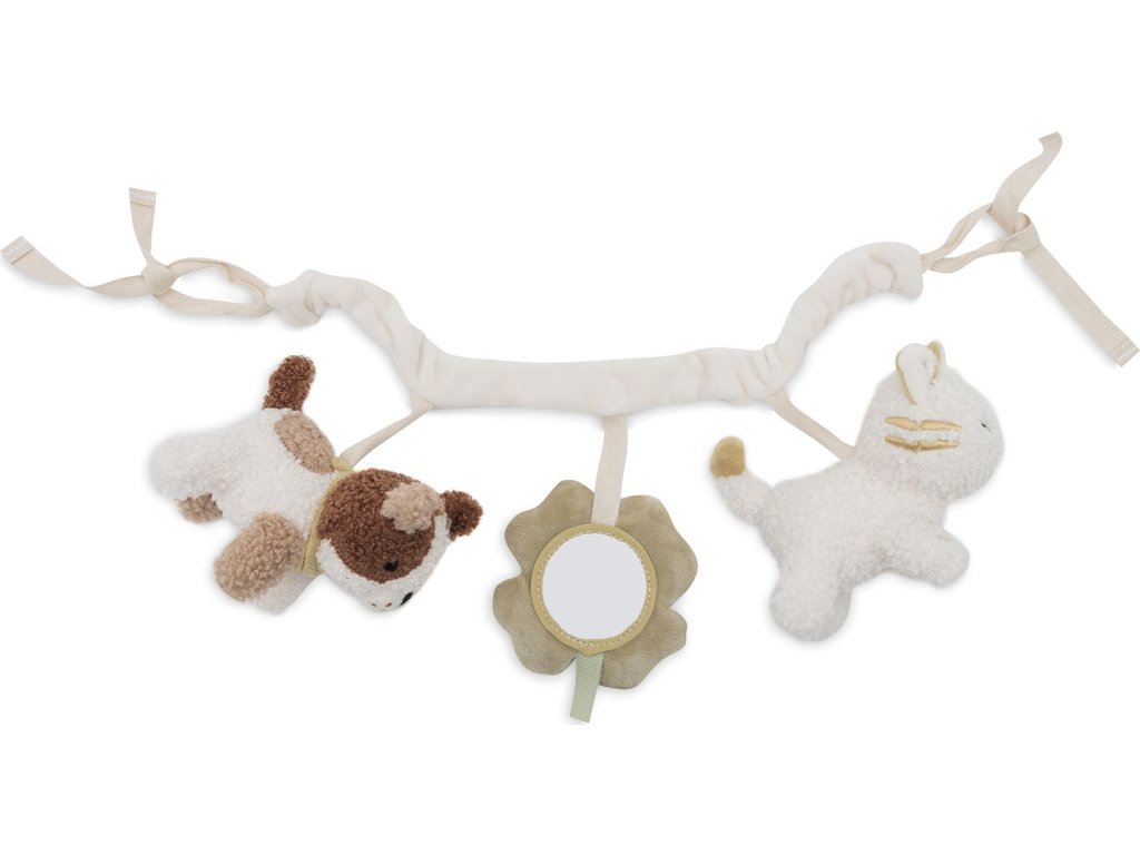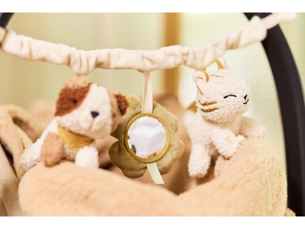 Řetěz na kočárek či autosedačku se zavěšenými hračkami v podobě pejska, kočičky a čtyřlístku s bezpečným zrcátkem zabaví vaše miminko v kočárku či autosedačce. Měkké hračky vyrobené z jemného plyše cinkají a nabízí různé textury pro zkoumání. Hračky stimulují koordinaci ruka / oko dítěte.