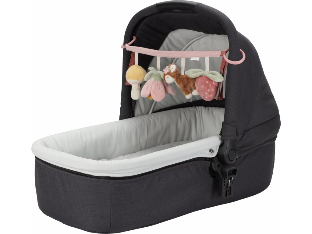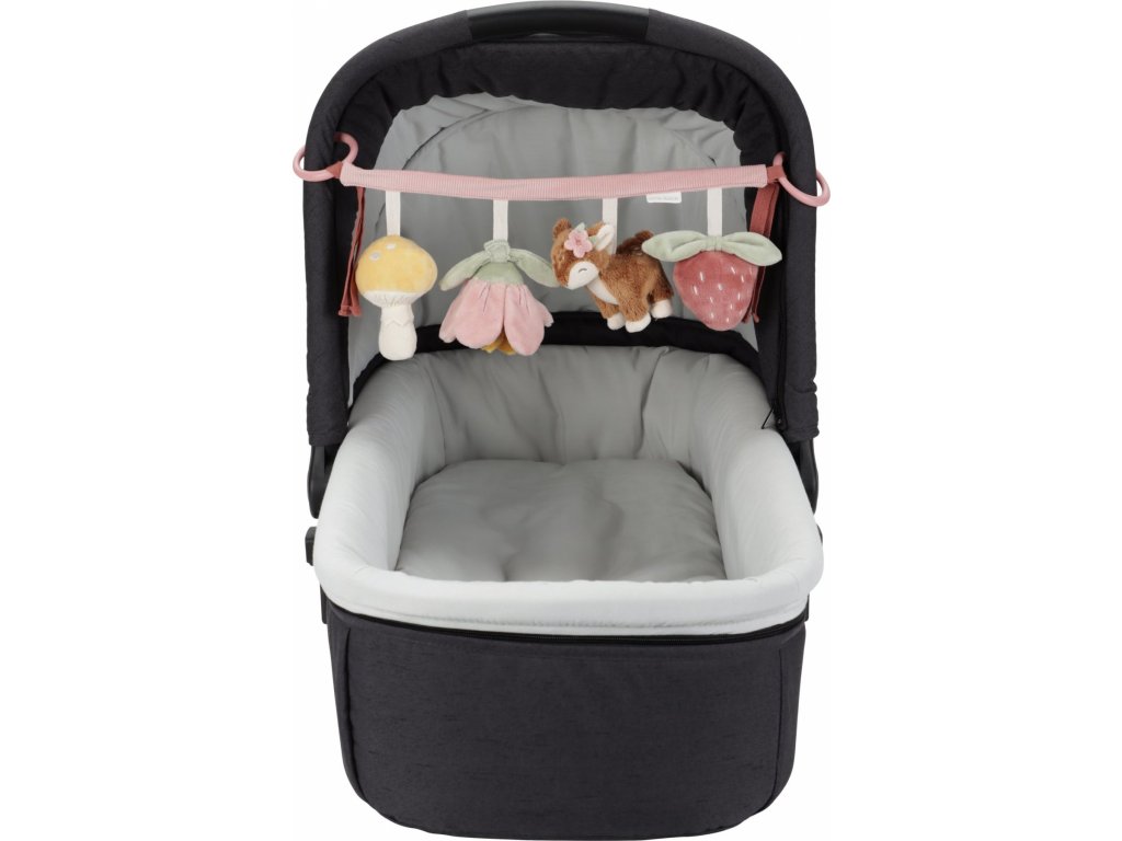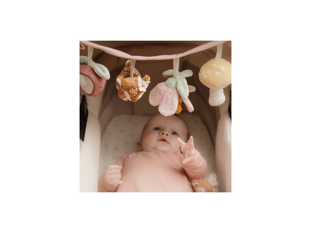 Čtyři zavěšené plyšové hračky v podobě srnky, květiny, houbičky a jahody zabaví vaše miminko na cestách v autosedačce či kočárku. Jednotlivé hračky při zkoumání dětskými ručičkami chrastí, po zmáčknutí pískají a šustí. Hračky stimulují koordinaci ruka / oko dítěte.
