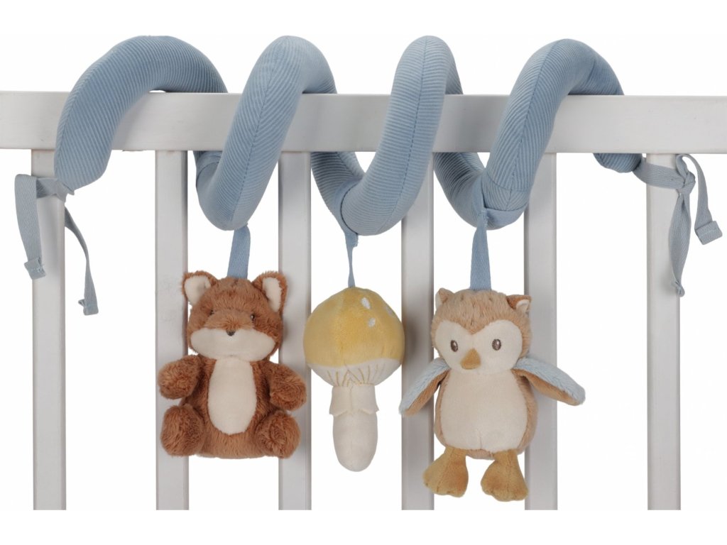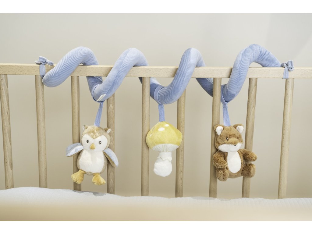 Textilní spirála se zavěšenými hračkami v podobě lišky, sovy a houbičky zabaví vaše miminko v postýlce, kočárku i v autosedačce. Měkké hračky vyrobené z jemného plyše chrastí, šustí a nabízí různé textury pro zkoumání. Hračky stimulují koordinaci ruka / oko dítěte.