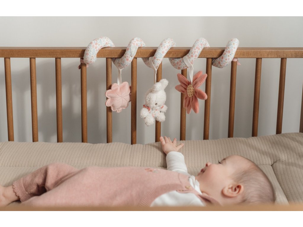 Textilní spirála se zavěšenými měkkými hračkami z jemného plyše v podobě králíčka, kytičky a čtyřlístku zabaví vaše miminko v postýlce, kočárku i v autosedačce. Hračky stimulují koordinaci ruka / oko dítěte.