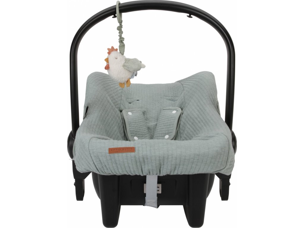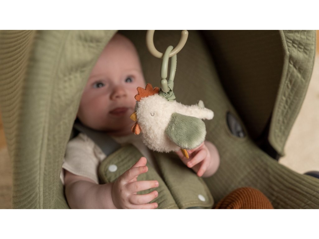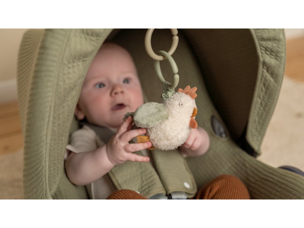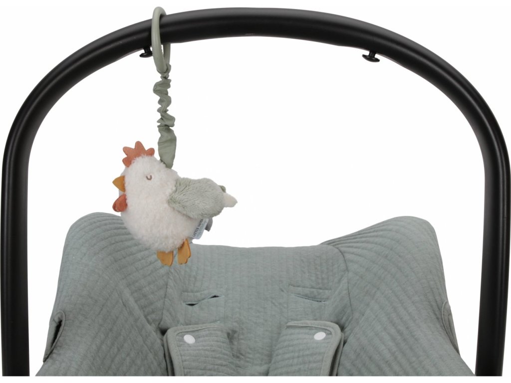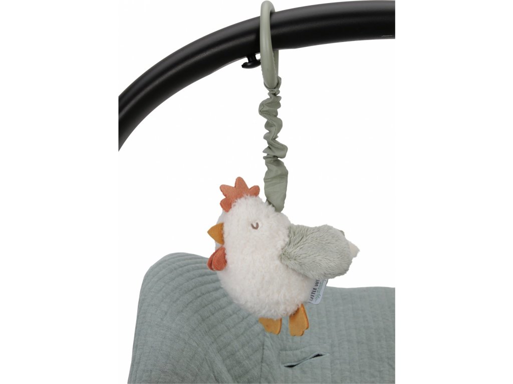 Plyšová slepička po zatažení za šňůrku vibruje a legračně poskakuje. Hračku je možné snadno zavěsit na autosedačku, kočárek či hrazdu na hrací dece.