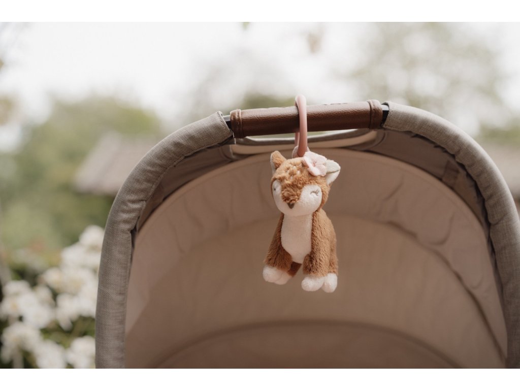 Plyšová srnka po zatažení za šňůrku vibruje a legračně poskakuje. Hračku je možné snadno zavěsit na autosedačku, kočárek či hrazdu na hrací dece.