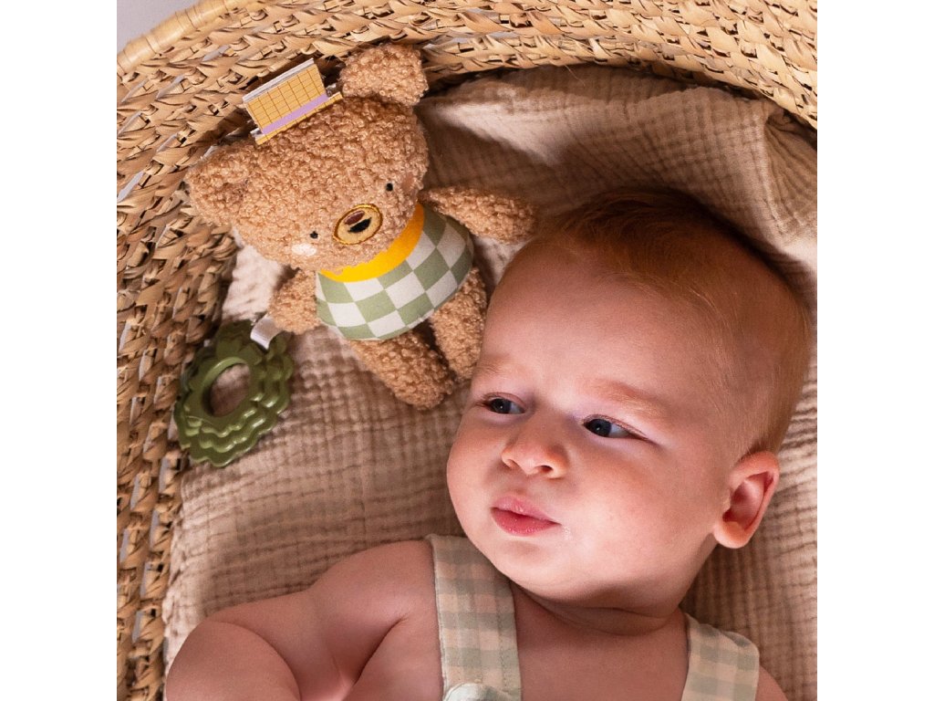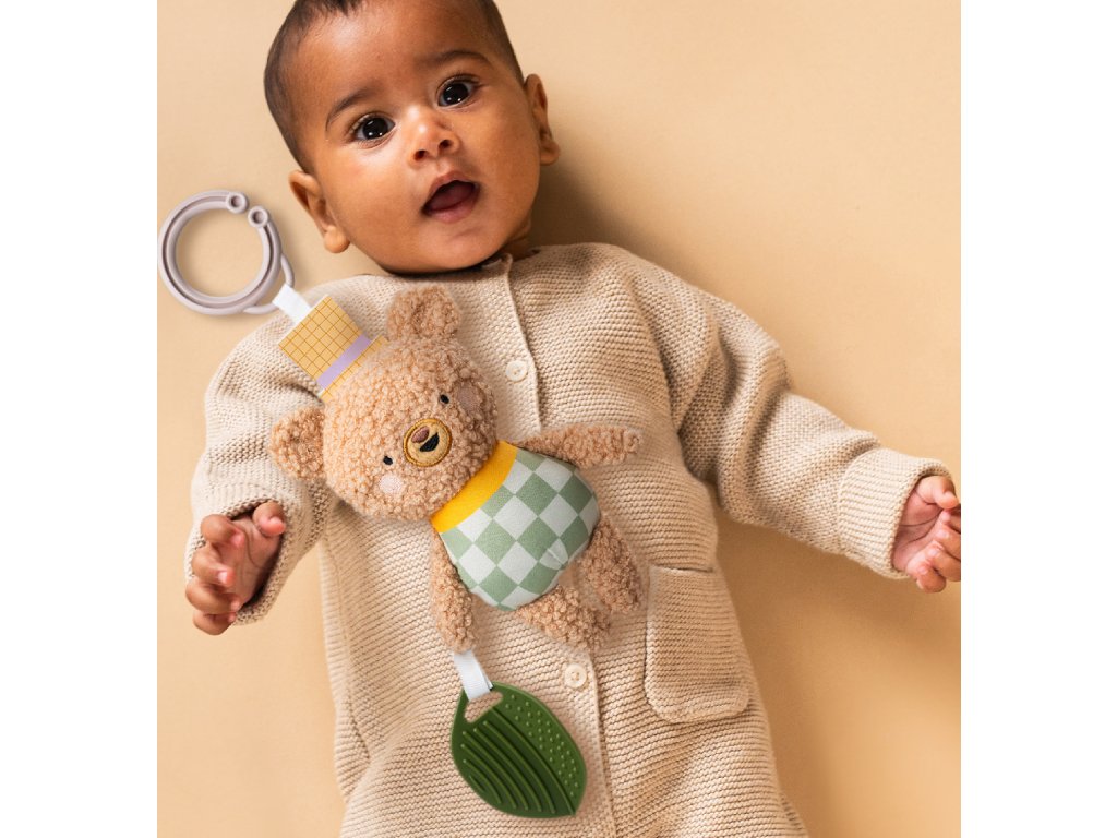 Závěsná plyšová hračka v podobě roztomilého medvídka Brendona při pohybu chrastí a při zmáčknutí šustí. Součástí hračky je i pružné kousátko ve tvaru listu. Díky závěsnému kroužku hračku snadno připevníte např. na autosedačku či kočárek.