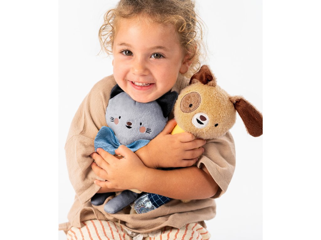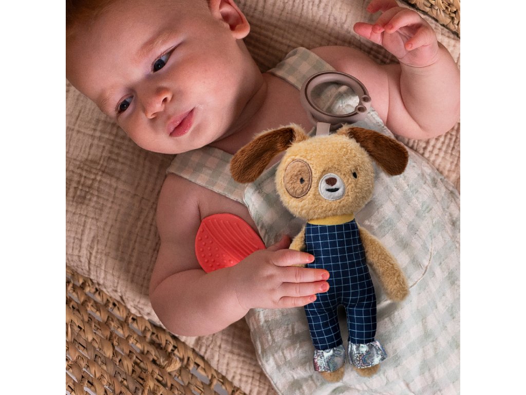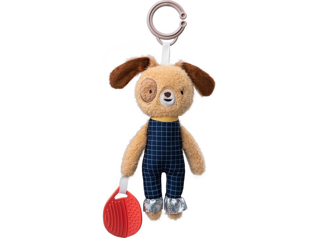 Závěsná plyšová hračka v podobě roztomilého pejska Daniela při pohybu chrastí a při zmáčknutí šustí. Součástí hračky je i pružné kousátko. Díky závěsnému kroužku hračku snadno připevníte např. na autosedačku či kočárek.