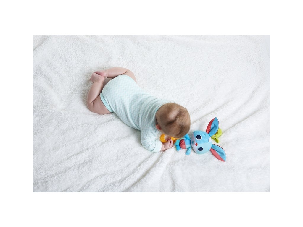 Měkká textilní hračka Tiny Love v podobě veselého králíčka chrastí a šustí a po natažení vibruje. Součástí hračky je i kousátko, které pomáhá ulevit citlivým dásním dítěte při prořezávání prvních zoubků.