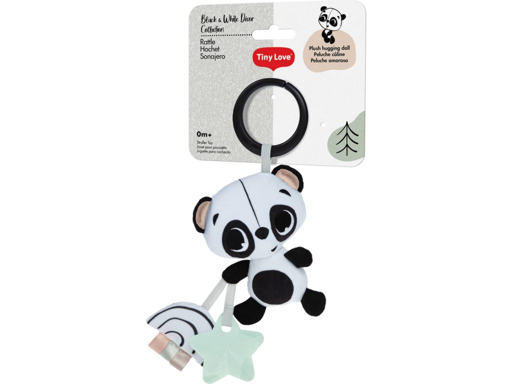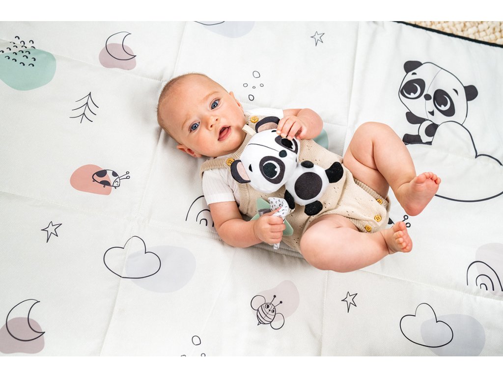 Měkká hračka v podobě roztomilé pandy při pohybu jemně chrastí. Různorodé textury na hračce lákají dítě ke zkoumání. Kroužek umožňuje snadné zavěšení na autosedačku, kočárek či potýlku.