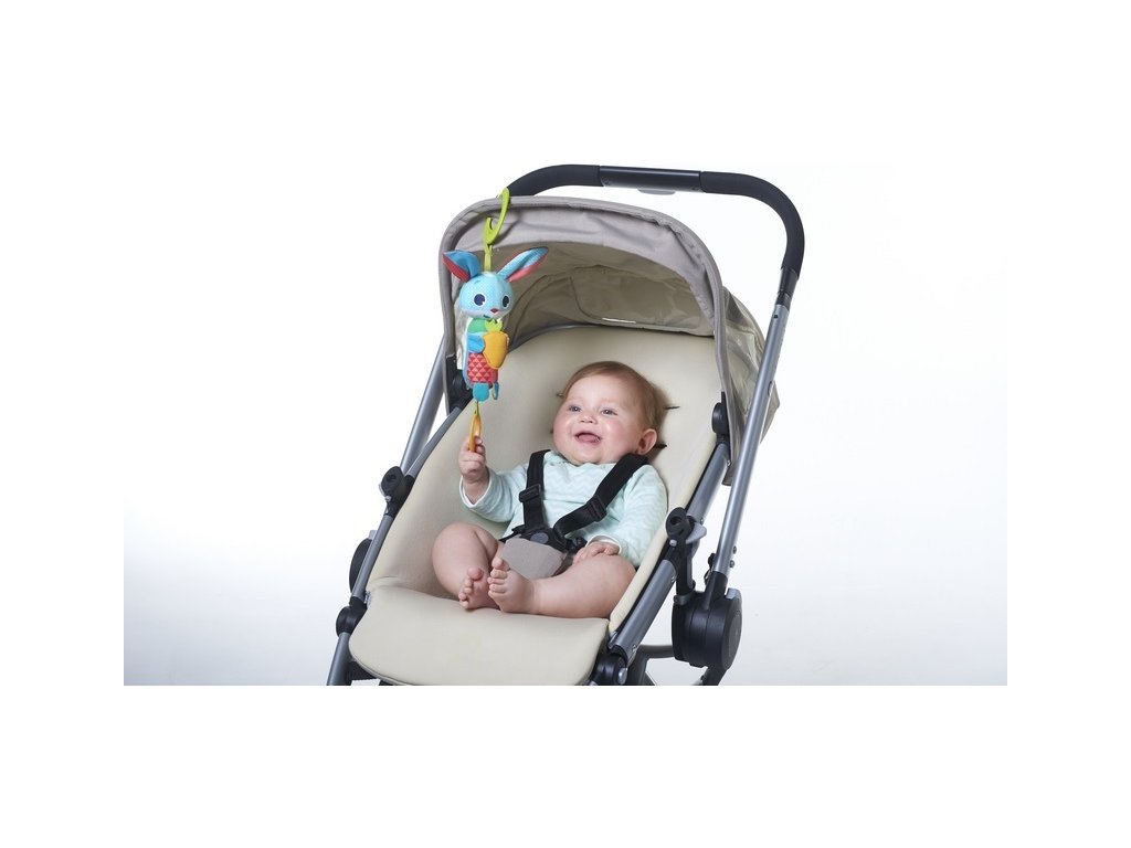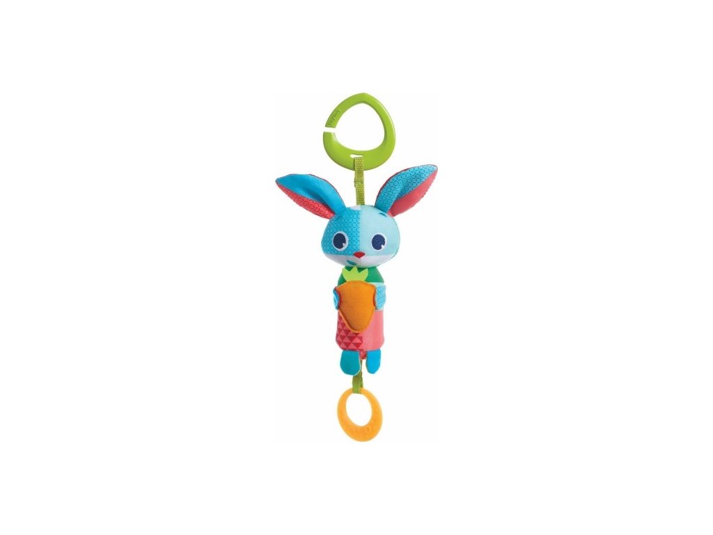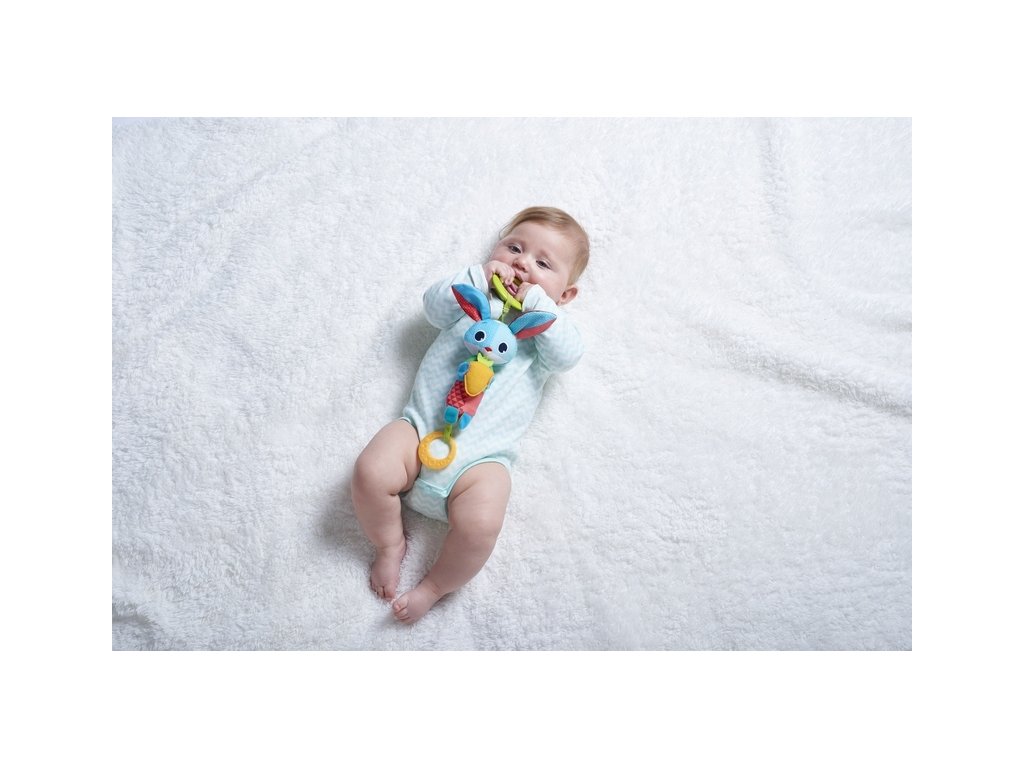 Měkká textilní hračka Tiny Love v podobě veselého králíčka při pohybu jemně cinká. Šusticí části upoutají pozornost dítěte při zkoumání rukama. Součástí hračky je i kousátko pro úlevu citlivým dětským dásním při prořezávání prvníchnh zoubků.