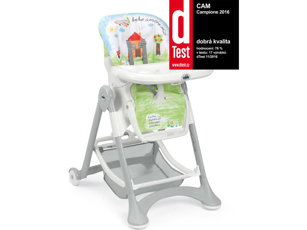 Nový široký pult lze odejmout jedním pohybem ruky. Tvar nohou židličky byl navržen tak, aby umožňoval snadný přístup k dítěti. Součástí židličky je i prostorný košík na úschovu hraček. Složená židlička Campione je velmi kompaktní a samostatně stojí. Všechny použité materiály jsou omyvatelné a snadno se udržují.