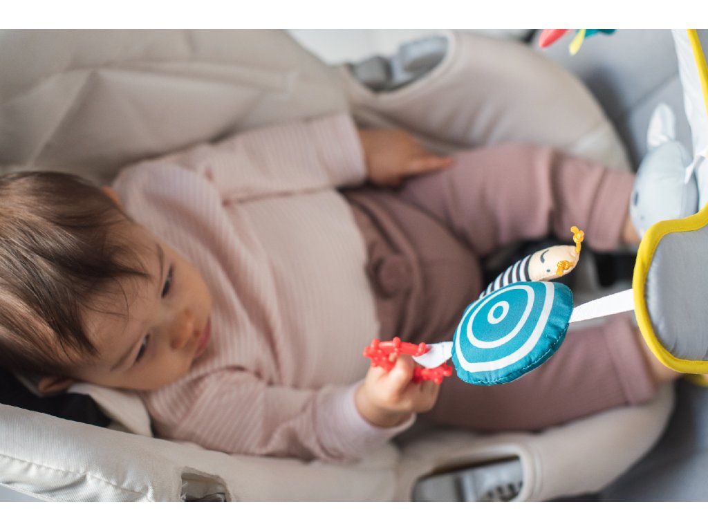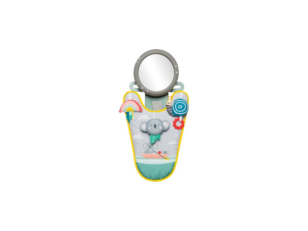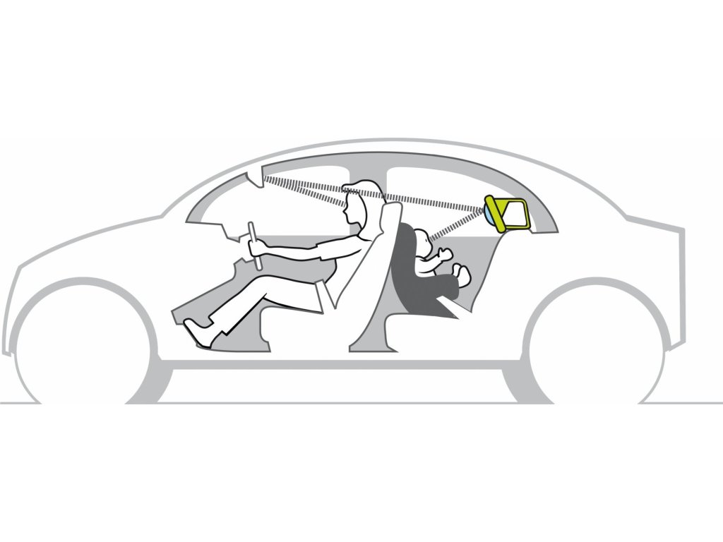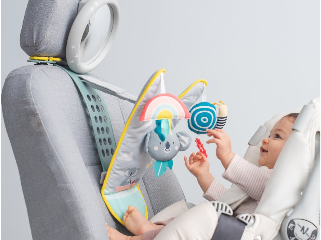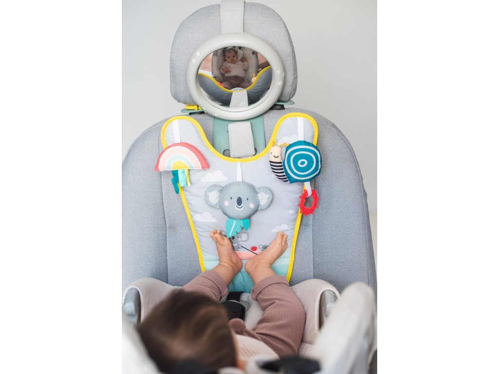 Hrací pultík se zavěšenými hračkami zabaví během jízdy dítě sedící v autosedačce proti směru jízdy. Zpětné zrcátko umožňuje rodiči dítě sledovat během jízdy.