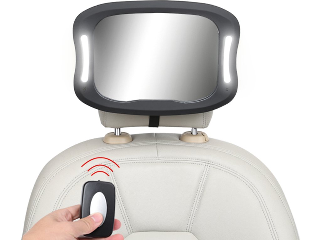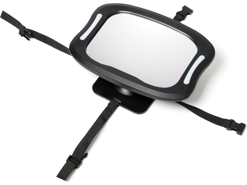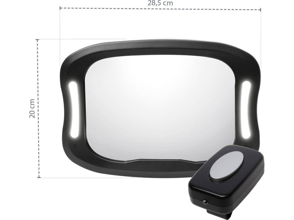 Mějte přehled o dítěti během jízdy i za tmy. Praktické zrcátko s LED osvětlením umožňuje na dítě vidět i za zhoršených světelných podmínek. Zrcátko je odolné proti rozbití a dá se snadno instalovat na opěrky hlavy sedadla. Má dlouhou výdrž baterií a dá se ovládat pomocí dálkového ovladače (zrcátko 3× AA, dálkové ovládání – 2× AAA. Baterie nejsou součástí balení.