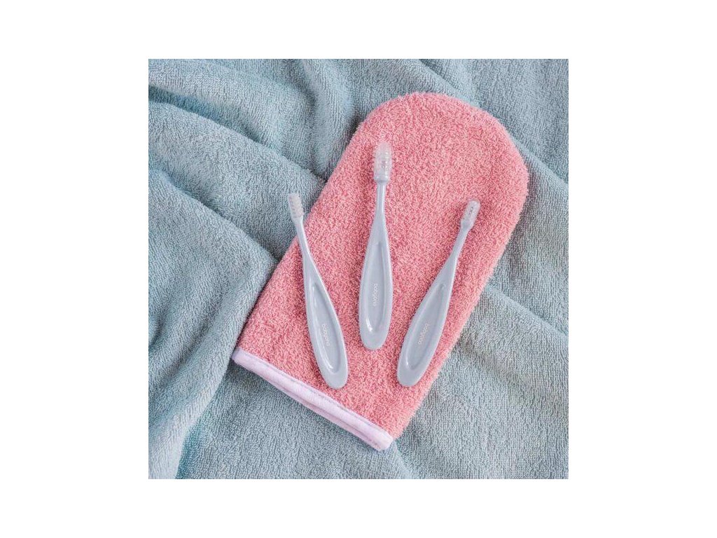 Set obsahuje: silikonový kartáček na masáž dásní, silikonový kartáček na čištění prvních zoubků, jemný kartáček s měkkým vlasem